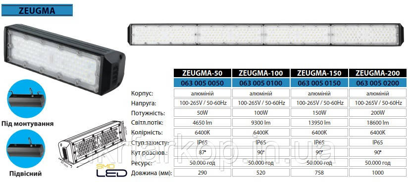 Світлодіодні світильники серії ZEUGMA призначені для освітлення виробничих, промислових, складських приміщень, виставкових комплексів, торговельно-розважальних центрів, спортивних об'єктів, критих парковок, автомийок, фарбувальних камер, СТО, об'єктів ЖКГ, житлових, адміністративних приміщень, гаражів тощо.